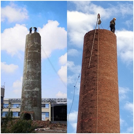 ②煙囪人工拆除方法:采取高空攀爬的作業(yè)方式登高到煙囪頂部,用拆除工具集合大錘、千斤頂進行簡體拆除,所拆磚塊要往煙囪內(nèi)部(或外壁)著落,在拆除時煙囪底部還要做好安全防護措施,預(yù)防有拆除的殘留磚塊或廢物高空墜落,具體要在煙囪上搭建一個安全平臺,這樣可以讓不小心墜落的殘留磚塊或廢物掉在安全平臺上,從而達到安全拆除的目標。