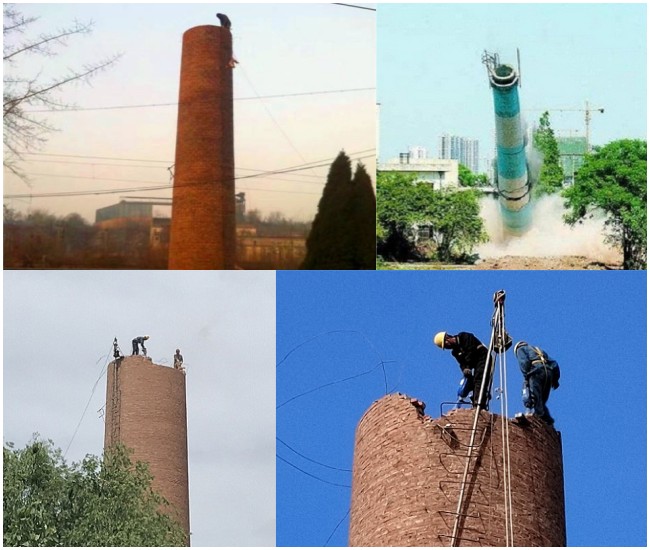 ②煙囪人工拆除方法:采取高空攀爬的作業(yè)方式登高到煙囪頂部,用拆除工具集合大錘、千斤頂進(jìn)行簡體拆除,所拆磚塊要往煙囪內(nèi)部(或外壁)著落,在拆除時(shí)煙囪底部還要做好安全防護(hù)措施,預(yù)防有拆除的殘留磚塊或廢物高空墜落,具體要在煙囪上搭建一個(gè)安全平臺(tái),這樣可以讓不小心墜落的殘留磚塊或廢物掉在安全平臺(tái)上,從而達(dá)到安全拆除的目標(biāo)。