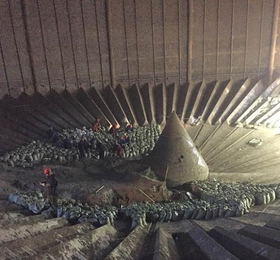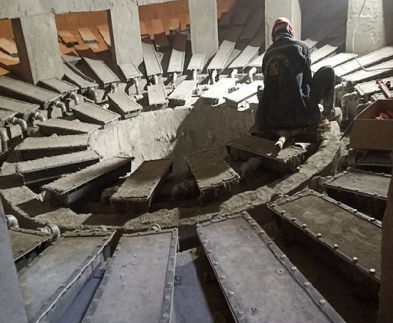 由于該儲存庫長時間運(yùn)行使用,導(dǎo)致庫底有積塊形成堵塞。首先施工人員從頂部進(jìn)到庫內(nèi),查看庫內(nèi)的余料情況。先從儲存庫的側(cè)門處開始,水泥庫清庫施工人員先將側(cè)門口堵塞的余料清出,方便施工人員進(jìn)出施工。將庫底原有下料口清理干凈,確保庫內(nèi)庫底下料口上下相通,使庫內(nèi)的余料能順暢地從庫內(nèi)流通到庫底的輸送設(shè)備。如下料口無法下料,就需先做一個臨時下料斜槽,供清理時下料。打開側(cè)門時先清理側(cè)門周圍的余料和積塊。施工人員站在庫側(cè)門的平臺上用Φ18棕繩或Φ18尼綸繩作保險之用,將保險繩的一端固定在離施工庫的庫底小庫門外的部位(平臺欄桿)上,保險繩的另一端則系在施工人員的腰部,作為保險。施工人員用風(fēng)鎬、鋼釬(螺紋鋼)和鐵鍬將庫底小庫門庫內(nèi)壁周圍的余料清理出庫外。