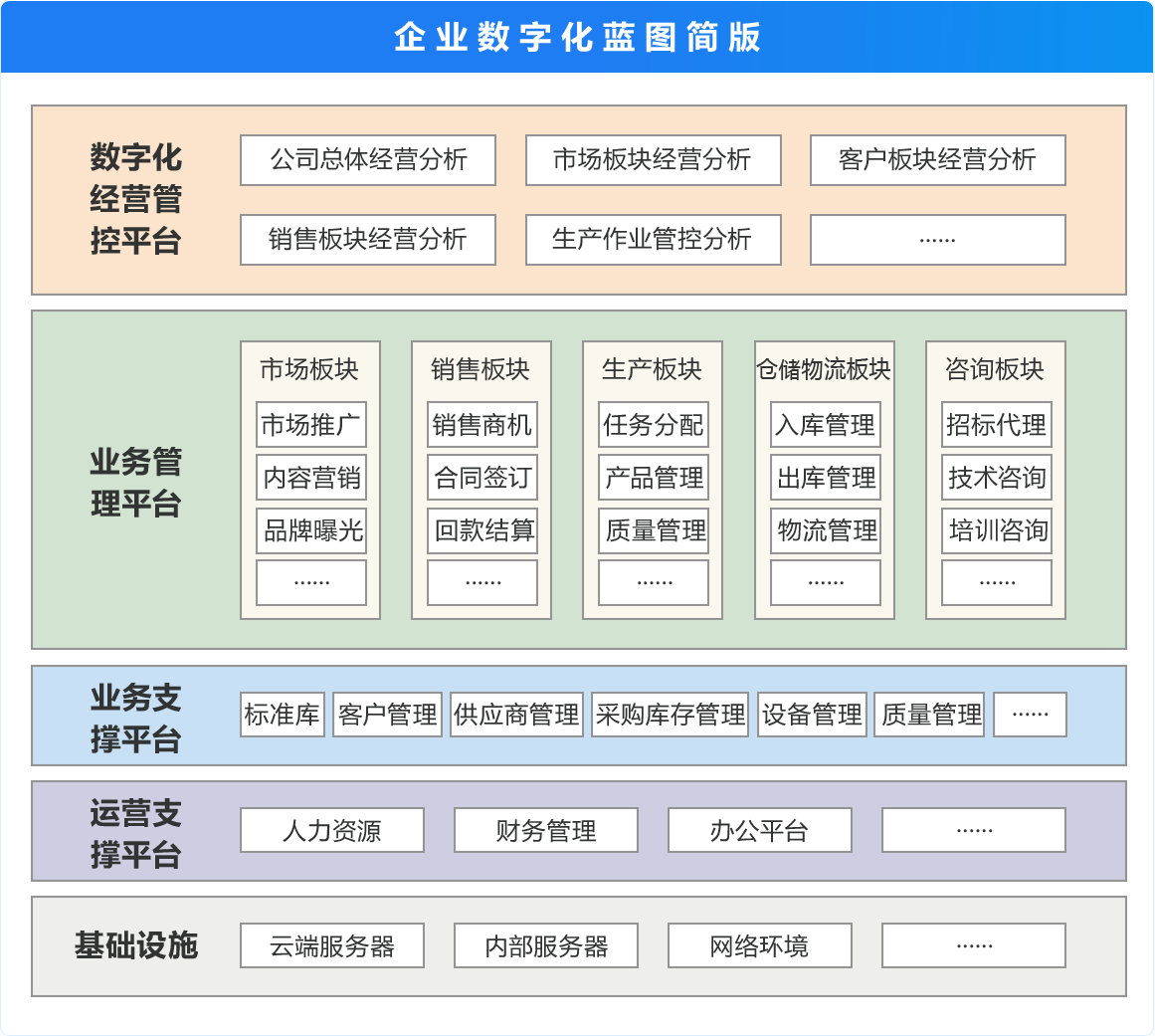 幫助企業(yè)建設(shè)客戶、供應(yīng)商、業(yè)務(wù)、財(cái)務(wù)、生產(chǎn)、協(xié)同辦公、異構(gòu)系統(tǒng)等一體化的數(shù)字化管理體系