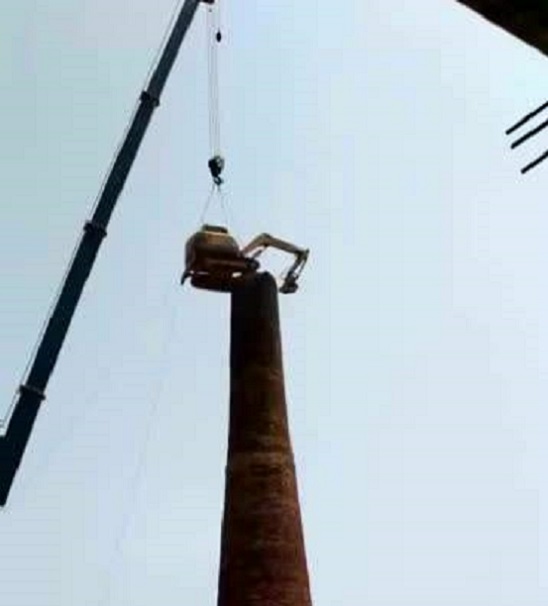 其一,這個拆除方案的限制很多,首先磚煙囪能否支撐小挖機的重量,并且還要在上面作業(yè),一般的磚結(jié)構(gòu)煙囪是沒有辦法采用此方案的。